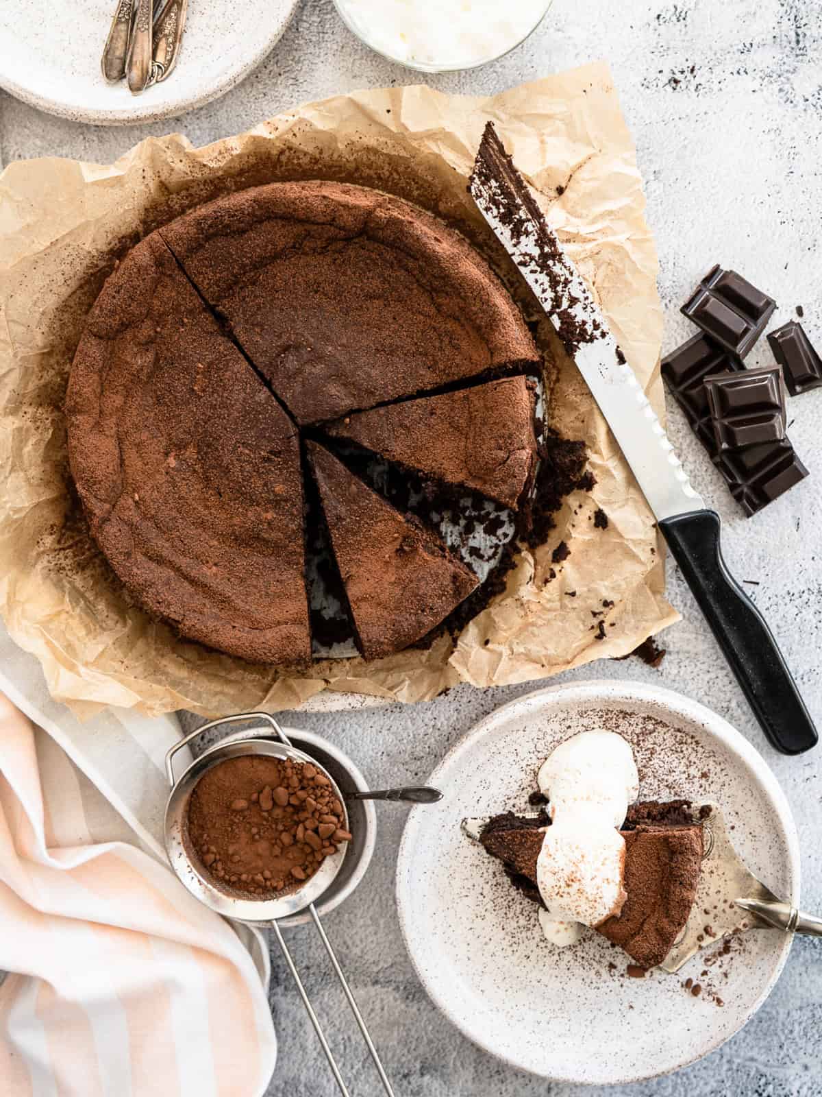 This lighter version of a flourless chocolate cake uses whipped egg yolks and egg whites to create an airy texture that "soufflés" as it bakes. It's rich, deeply chocolatey and made with just a handful of ingredients. If you are craving a serious chocolate fix this is the recipe for you!