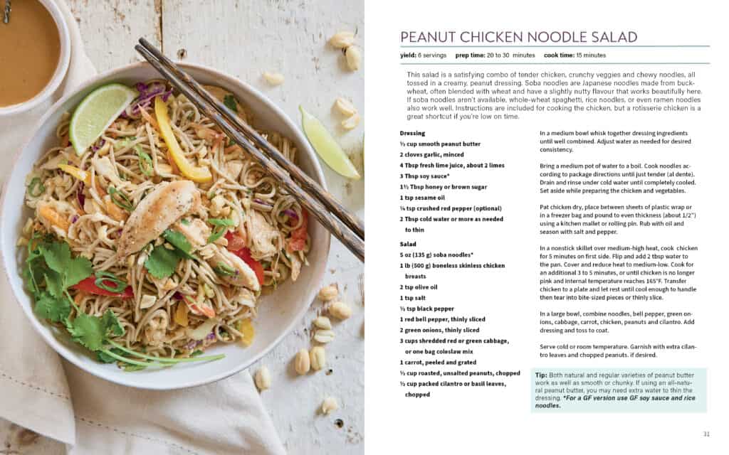 - Chapters covering Breakfast, Salads, Soups, Main Dishes (chicken, fish & seafood, meat, and vegetarian), Sides, Dips & Dressings, and Sweet Treats.