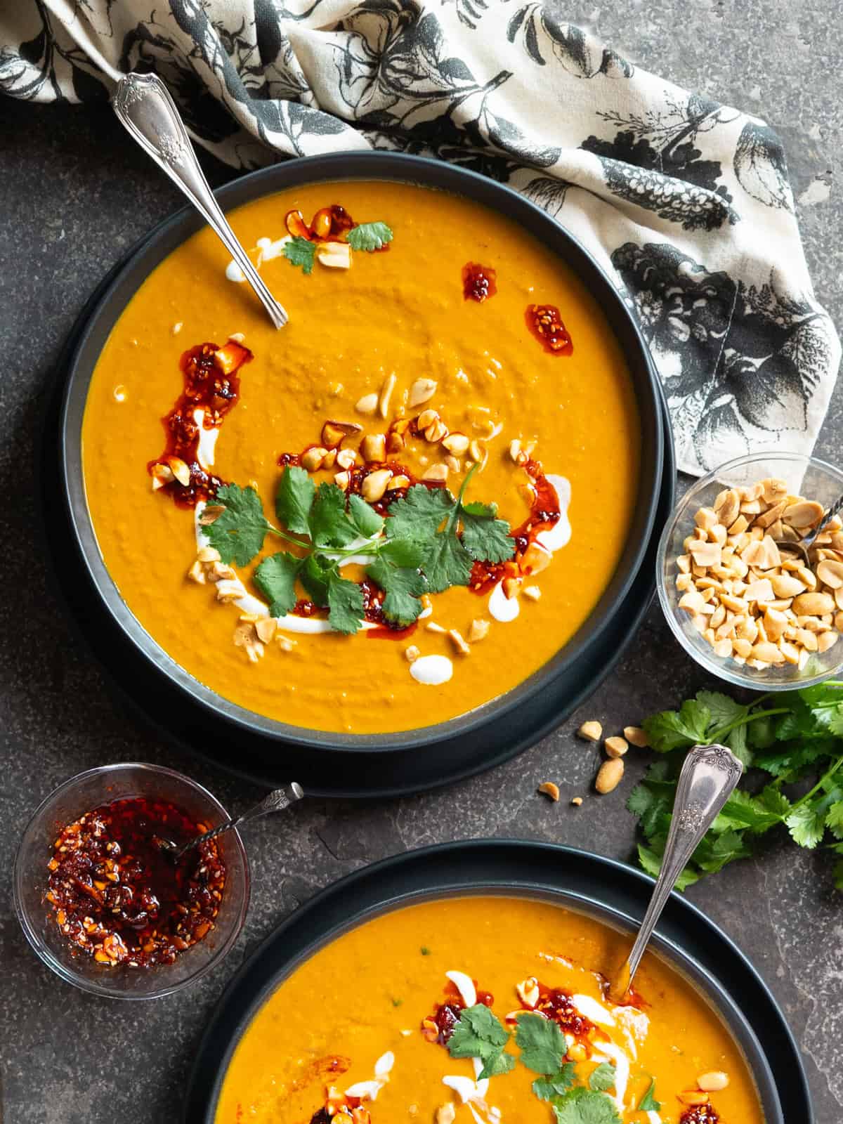 Spicy Pumpkin Peanut Soup with Coconut Milk is an easy recipe made with ingredients you might already have on hand. It comes together quickly and has a deep flavour thanks to Thai red curry paste, peanut butter and coconut milk. A few simple garnishes like store-bought chili crisp, chopped roasted peanuts and fresh cilantro leaves take it from every day soup to something special.